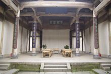 前廳是整幢房子中最精華的部分,大門后面聳立著一幅威儀的中門,在中門“福”字的上方,鑲有一幅木雕“百子鬧元宵”圖,圖上雕刻著100個(gè)小男孩過元宵鬧花燈時(shí)的情景,這正是古代“多子多!眰鹘y(tǒng)觀念的生動寫照,“百子鬧元宵”圖兩邊的“商”字斗拱上則分別雕有四出《三國演義》的戲文,斗拱的上方雕有“南、北”財(cái)神,“南、北”財(cái)神的上方是閣樓護(hù)板,在此,汪定貴設(shè)計(jì)了“漁、樵、耕、讀”四根木雕立柱,分別代表了古代的四種職業(yè)。