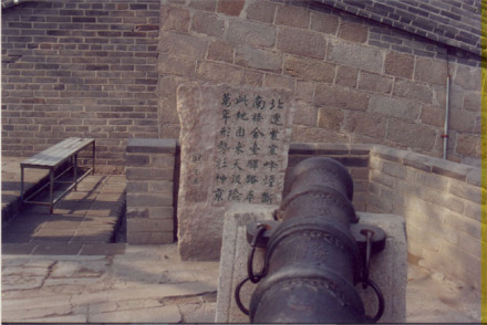 陳展于八達嶺關(guān)城內(nèi)登城入口處的馬道旁,共有五尊鐵炮,為當時的先進武器之一。其中最大一尊炮筒長2.85米,口徑105毫米,射程達千米以上,威力甚大。炮身上刻有"敕賜神威大將軍"字樣,為明代崇禎十一年(1638年)制造。該炮是1958年從八達嶺東十余里的張堡地方運來的。另外四尊牛腿小炮,為1957年整修長城時的出土文物,同時還發(fā)掘出數(shù)百枚炮彈,均為明朝制品。據(jù)《武備志》記載:“古代以機發(fā)石,其機之木架,形如虎蹲。后來使用火炮,炮身短而粗大,以發(fā)開花彈者,名虎蹲炮,俗稱田雞炮”,由此可見當時武器情況之強盛。