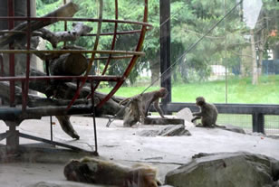 猴山位于園的東部,占地面積約1000平方米,為下沉式結(jié)構(gòu),場(chǎng)館中央用山石堆積成兩座假山,之間懸掛軟梯、輪胎等游樂設(shè)施。外圍橢圓形的圍墻,圍墻高3.1米,從假山到圍墻的距離為5.9米。在北側(cè)的圍墻處,有一空間,可供猴群在惡劣的天氣里遮風(fēng)避雨。1986年和1993年,兩次對(duì)猴山進(jìn)行維修和改造,加固山石,接通上、下水。因不時(shí)會(huì)發(fā)生頑皮、健壯的成年猴子,借山石之力躍出猴山,為此,沿墻壁設(shè)置低壓電網(wǎng),并根據(jù)猴子對(duì)色彩的不同反映,在電網(wǎng)處涂上紅、白兩種顏色,以引起猴子的警覺。