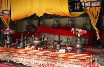 俗稱臥佛寺,位于海淀區(qū)香山壽安山南,始建于唐,清雍正十二年(1734年)大修后賜名“十方普覺寺”。全寺規(guī)模宏大,總體布局和建筑配置一定程度上保留了唐宋寺院的特點(diǎn)。臥佛殿內(nèi)的銅質(zhì)臥佛為元代遺存,長5.3米,高1.6米,重4噸,頭朝西面,面向南,鑄造精良,是中國現(xiàn)存最大的銅質(zhì)臥佛,具有較高價值,也是科技史研究的重要實(shí)物資料。