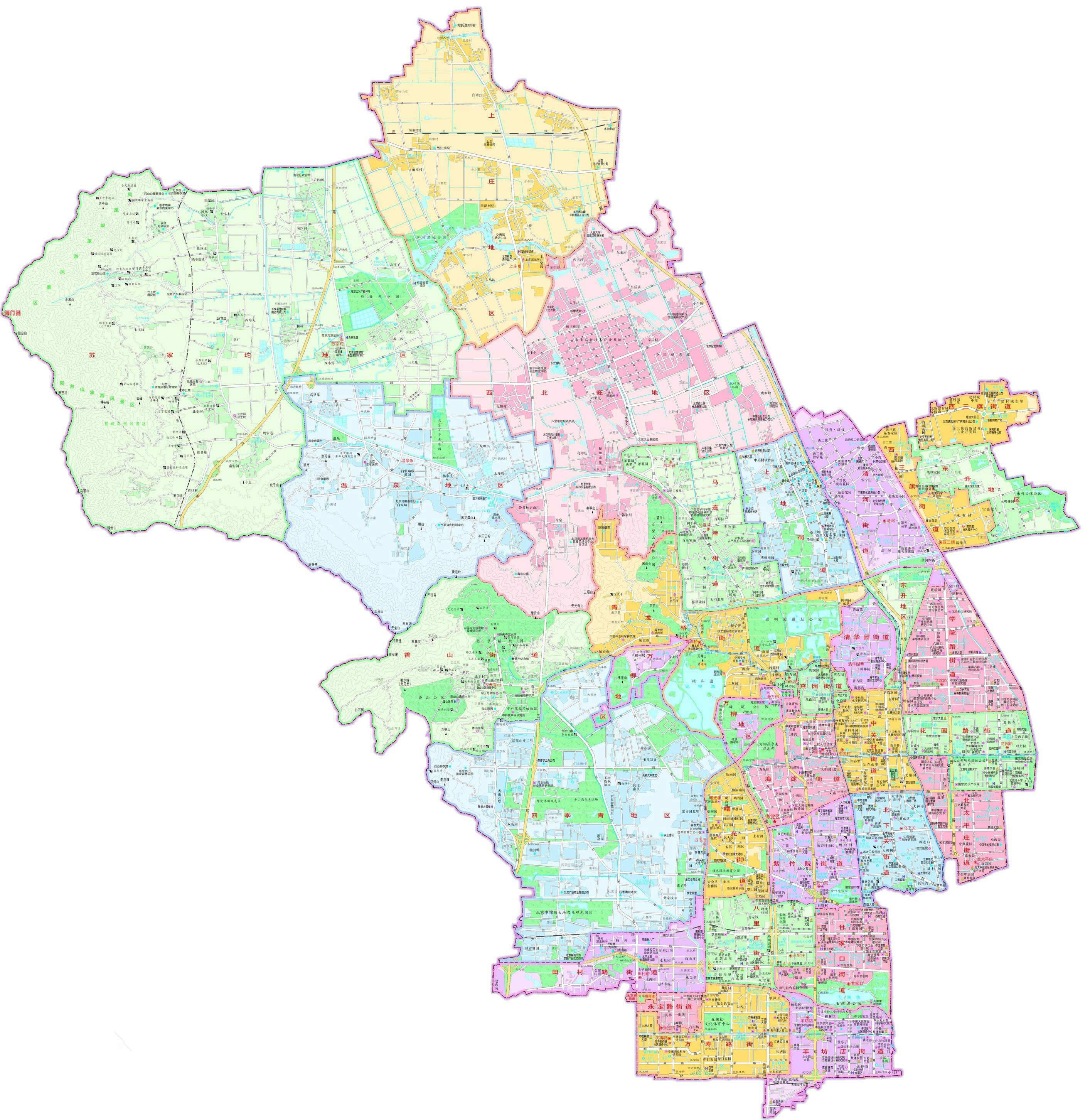 街道:萬壽路街道、永定路街道、羊坊店街道、甘家口街道、八里莊街道、紫竹院街道、北下關(guān)街道、北太平莊街道、學(xué)院路街道、中關(guān)村街道、海淀街道、青龍橋街道、清華園街道、燕園街道、香山街道、清河街道、花園路街道、西三旗街道、馬連洼街道、田村路街道、上地街道、曙光街道