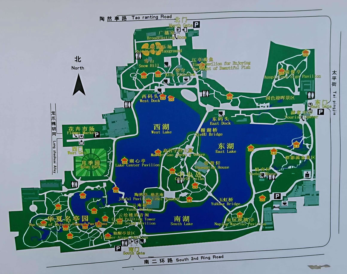 陶然亭公園內有勝春山房景區(qū)、華夏名亭景區(qū)、陶然佳境景區(qū)、陶然佳境景區(qū)、潭影流金景區(qū)等各具特色的景區(qū)。其中著名的陶然亭位于湖中央島的陶然佳境景區(qū),陶然亭周圍,有許多著名的歷史勝跡。西北有龍樹寺,寺內有蒹葭簃、天倪閣、看山樓、抱冰堂等建筑,堪與陶然亭相匹。東南有黑龍?zhí)、龍王亭、哪吒廟、刺梅園、祖園;西南有風氏園;正北有窯臺;東北有香冢、鸚鵡冢,以及近代的醉郭墓、賽金花墓等。這些歷史勝跡產生年代多早于陶然亭,有的甚至早于慈悲庵。它們都有文人墨客觴詠的歷史,曾現(xiàn)過各領風騷的輝煌時期。