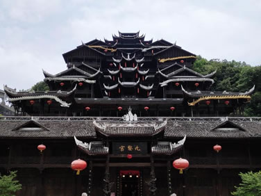 九黎宮位于景區(qū)中心苗族文化廣場右邊,是蚩尤九黎城最重要的標(biāo)志性建筑,九黎宮科學(xué)地利用山水自然資源,因地制宜,依山造勢,退山而居。宮高99米,呈十一開間,象征“九九歸一”之意。建筑的形式有四合院、吊腳樓、沖天樓,宮內(nèi)有苗族接龍?zhí)、曬樓、虎口堂、四合院、八字朝門和吊腳樓群等,是彭水展示苗族文化、民風(fēng)民俗的博物館,是迄今為止最大的吊腳樓群之一,被列入大世界基尼斯之最。