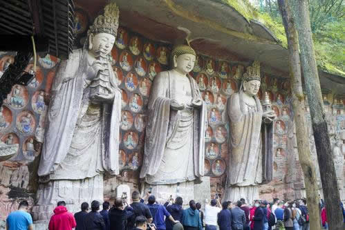 重慶市的大足石刻以其規(guī)模宏大、雕刻精美、題材多樣、內(nèi)涵豐富和保存完整而著稱于世。它集中國(guó)佛教、道教、儒家“三教”造像藝術(shù)的精華,以鮮明的民族化和生活化特色,成為中國(guó)石窟藝術(shù)中一顆璀璨的明珠。它以大量的實(shí)物形象和文字史料,從不同側(cè)面展示了九世紀(jì)末至十三世紀(jì)中葉中國(guó)石刻藝術(shù)的風(fēng)格和民間宗教信仰的發(fā)展變化,對(duì)中國(guó)石刻藝術(shù)的創(chuàng)新與發(fā)展做出了重要貢獻(xiàn),具有前代石窟不可替代的歷史、藝術(shù)和科學(xué)價(jià)值。許多歐洲人、尤其是法國(guó)人,對(duì)大足石刻寵愛(ài)倍加。