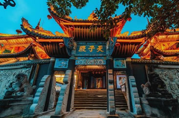 天子殿座西向東,最早修建于西晉,已有1600多年歷史,現(xiàn)存的天子殿是清康熙三年(1663年)重修的,已有三百多年歷史。全殿占地2431平方米,由牌坊、山門、殿堂三部分組成,對(duì)稱地排列在一條中軸線上。牌坊為木石結(jié)構(gòu)的三重檐坊,高約10公尺,山門為重檐歇山式屋頂,兩邊的鐘鼓樓均為四角攢尖頂,殿堂為磚木結(jié)構(gòu),硬山式屋頂,穿逗式梁架。該殿系鬼城的核心部分,也是名山上建筑年代最久,面積、規(guī)模最大,保存最完整的一座廟宇。