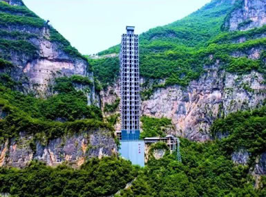 垂直觀光電梯(特種設備圓弧形防火防水室外垂直觀光電梯)高度185米,主要結構體系為鋼結構。雙向運行,單箱承載1600千克21人(雙向同時42人)。總投資1.2億元,工程完成90%。