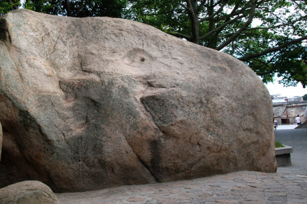 石僧拜塔位于風動石左前側(cè)丘嶺之上,為一天然巨石,高約4米,其形酷似身披袈裟的僧人,跪地而揖,面向隔海的東門嶼文峰塔,故名,亦稱“禮僧石”。古人有詩贊曰:“怪石立山門,巋然道貌尊,折腰如合什,低首卻忘言。發(fā)禿寒花補,衣緇積蘚皴。九年面壁者,應是汝前身。” 有人傳言,此一“怪石”原為千百年前的一位高賢志士,因不滿朝政腐敗,天下黑暗,罷官而歸。他誓不與世浮沉,遂遁入空門,四處浪跡云游,最后涉海而入東山絕島,悟得此生路已走盡,嘆西天到底無門,唯有眼前無塵的“大浸”(即大海)是其歸宿,于是朝東面海入定,魂逐長波而去,留下法相幻化為石,即此石僧。