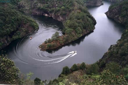石門湖——坐落于冠豸山東南的石門湖,面積四百多畝,如一塊翡翠,鑲嵌在冠豸山的險(xiǎn)峰奇谷中,四周環(huán)山,“是連城昔日八景之一的"石門宿云"所在地。 要深度感受石門湖的清幽以及風(fēng)景如畫,選擇蕩舟其間,無疑是最好的方式。登上游船,緩緩前行,船漿劃破波光瀲滟的湖面,推動(dòng)著小舟時(shí)而穿過狹窄的峽谷,時(shí)而閑庭信步開闊的湖面,“水轉(zhuǎn)山間走,山回水中行”,山風(fēng)習(xí)習(xí),清涼舒坦。山在慢慢后退,水在慢慢后退,眼看就到湖的盡頭,“山窮水盡疑無路”,卻“柳暗花明又一村”,豁然開朗處曲徑通幽,山環(huán)水繞,水傍山立。