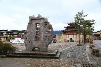 東門街兩旁老房子擠擠挨挨,多為磚木結(jié)構(gòu)。街面鋪設(shè)石板,塊塊光滑,雨后更是光潔如鏡,如詩如畫。詩云:“江南冷雨北吹斜,人影百姿映在街。潔石鏡明非打銼,但憑千載萬家鞋。”街面每隔100米就有一個(gè)用條石鋪成,狀似棋盤的圖案,當(dāng)?shù)厝朔Q其為棋盤石。棋盤石有何作用呢?傳統(tǒng)的說法是:和平歷代都有大量的人士中科舉或在外做官,他們衣錦還鄉(xiāng),榮宗耀祖,騎馬或坐轎回來,進(jìn)入城堡,每到一塊棋盤石就停住,下馬或下轎稍停片刻,以顯示他的榮耀和光彩。還有一個(gè)作用是:有一定身分或地位的人家出殯,棺木每抬到一處棋盤石就停下來,讓孝子賢孫們跪下叩拜,拜完再抬起棺木往前走。一般沒有官職或身分地位的人家則沒有在這里停棺叩拜的資格。