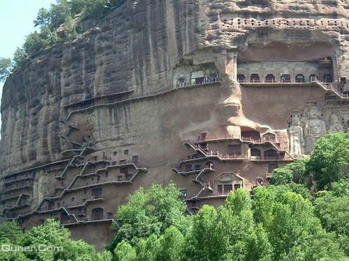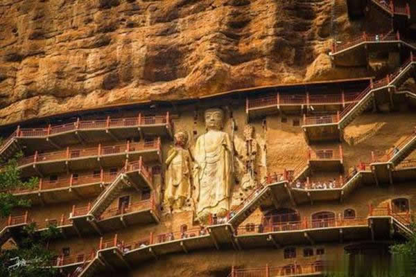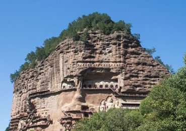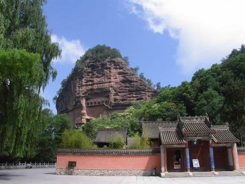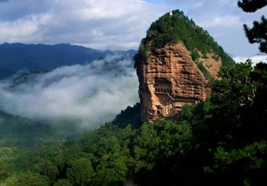 麥積山石窟坐落于西秦嶺東段,小隴山林區(qū)崇山峻嶺中,因山崖一峰突兀挺立,拔地而起,猶如農(nóng)家麥垛,故名麥積山。山高142m,頂端有隋代舍利磚塔,古老孑遺植物白皮松遍布塔周;懸崖絕壁上雕鑿著1600余年來(lái)的209個(gè)洞窟7866身泥塑石雕及1300多平米壁畫,為此麥積山石窟為中國(guó)四大石窟之一,有東方雕塑陳列館之稱。摩崖造像、凌空棧道與蒼松翠竹、赤壁丹崖相互映襯,有麥積煙雨等神奇景觀。