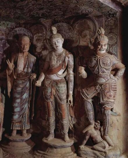 五代、宋屬于瓜沙曹氏政權(quán)時(shí)期,由于政治上的安定,經(jīng)濟(jì)上的繁榮,建立了都勾當(dāng)畫院和伎術(shù)院,有一支專門開窟造像畫壁畫的隊(duì)伍,繼承晚唐時(shí)代殿堂中心佛壇窟形制,塑像置于中心佛壇上,多者一鋪九身。早期彩塑主尊多為主體性圓塑,脅侍多為高浮塑,飛天、羽人、龍頭、鳳首等附屬性題材則多屬模制影塑(亦稱影壁),大量侍從弟子、菩薩,則以壁畫表現(xiàn)。總之,以多種手法表現(xiàn)以佛陀為中心的說法場(chǎng)面。早期彩塑傳自西域,但人物造型、衣冠服飾,無不隨著地域、時(shí)代的不同而演變發(fā)展。北魏孝文帝改制以前,面相豐圓,肢體拙壯,鼻直眼大,肩寬胸平,或直立或端坐,均少動(dòng)態(tài)。佛像多著通肩式或右袒式紅色袈裟,衣紋密集而突起,類似犍陀羅雕刻手法,但隨即變?yōu)殛幙叹紋。菩薩則高髻寶冠,發(fā)披兩肩,上身半裸或斜挎“天衣”,腰束長(zhǎng)裙。塑像的塑造手法簡(jiǎn)練,色彩明快,神態(tài)端莊,許多方面都可看出漢晉雕塑傳統(tǒng)與西域佛教造像互相融合的痕跡。這與敦煌“地接西域”、“華戎所交”的歷史環(huán)境是分不開的。