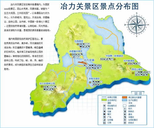 冶力關(guān)風(fēng)景區(qū)在臨潭縣境內(nèi),以臨潭縣冶力關(guān)為中心,分為蓮山、西峽、東峽和冶海湖四個景區(qū)。主要景觀有蓮花山、冶木峽、冶海湖、赤壁幽谷、巨型臥佛、黃捻子、香子溝等景觀。