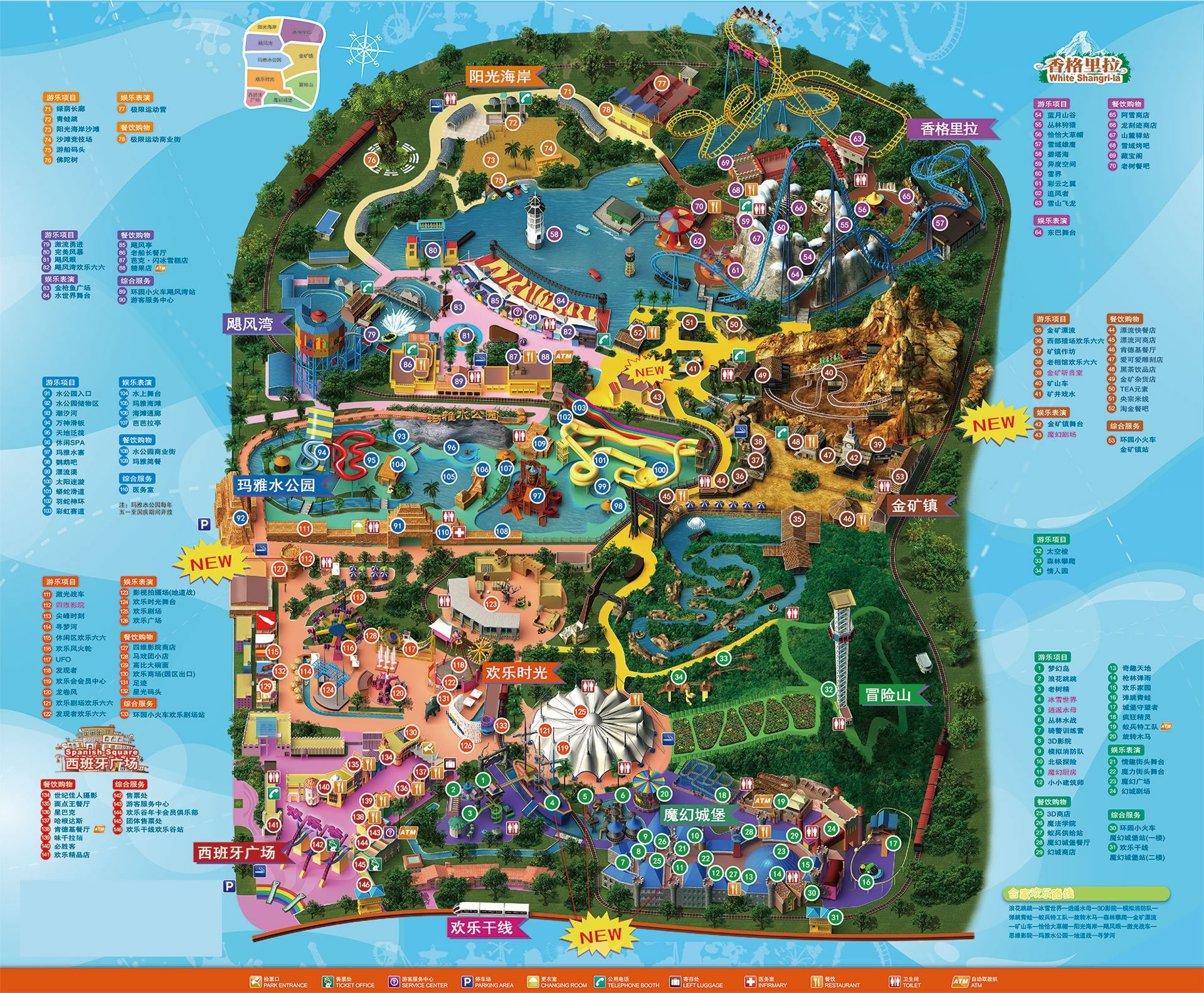 全公園共分八大主題區(qū):西班牙廣場、卡通城、冒險山、歡樂島、金礦鎮(zhèn)、香格里拉森林、颶風(fēng)灣、陽光海岸,加上奇趣的瑪雅水公園,有一百多個老少皆宜、豐富多彩的游樂項目。從美國、荷蘭、德國等發(fā)達(dá)國家引入眾多全國乃至亞洲獨有的項目:世界最高落差的"激流勇進(jìn)"、中國第一座懸掛式過山車"雪山飛龍"、中國第一座巷道式"礦山車"、中國第一座"完美風(fēng)暴"、中國第一輛"仿古典式環(huán)園小火車"、亞洲最高、中國第一座"驚險之塔"--太空梭、亞洲首座集視覺、聽覺、觸覺于一體的四維影院。這些游樂項目附以了逼真而完美的主題包裝,營造出環(huán)境優(yōu)美宜人,具有美國西部和中國藏北風(fēng)格的景觀。一次次驚心動魄的歷程,一個個撲朔迷離的故事,讓游客仿佛進(jìn)入一個亦真亦幻的神秘境界。