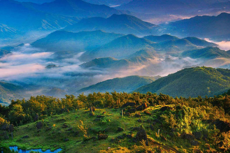 地貌 境內(nèi)地勢(shì)西北高東南低,主要是十萬(wàn)大山和其支脈東山,以及一些零星山脈,山脈呈東北——西南走向,平面形狀略呈菱形,一般坡度35°—45°之間。北倚十萬(wàn)大山,西北峻嶺林立,高峰挺拔,最高峰為板八村的久寶山,海拔1448米;中部山丘錯(cuò)雜,連綿起伏,東南是丘陵地帶,間有小塊平原。