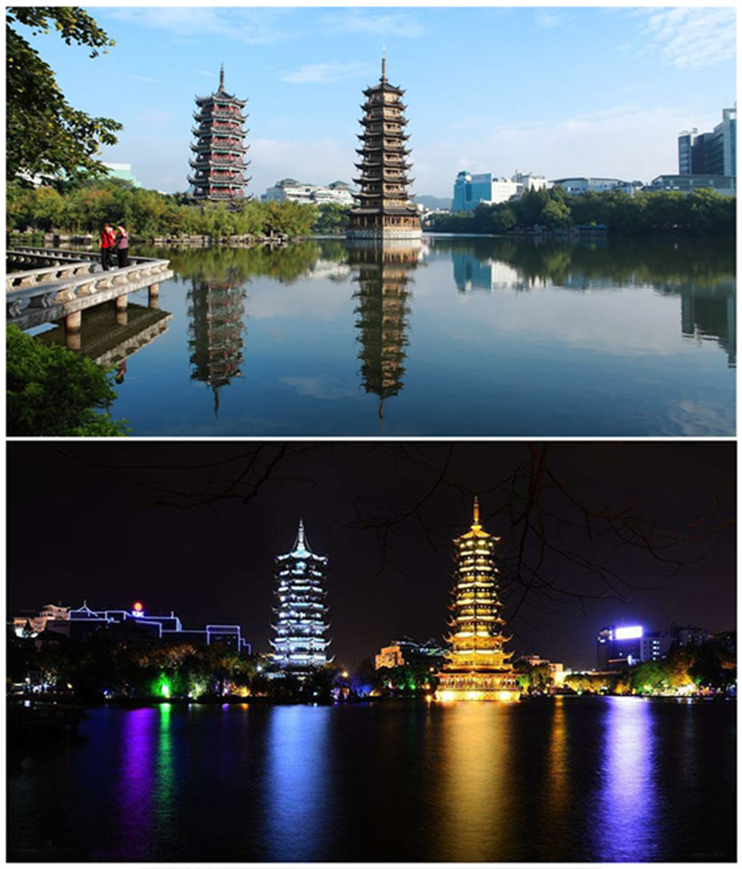 日月雙塔地處桂林市中心區(qū),坐落在桂林城的中軸線上,與“象山水月”相鄰。象山是桂林的城徽,而雙塔則是新桂林的標(biāo)識。日塔、月塔與象山上的普賢塔、塔山上的壽佛塔,相互呼應(yīng),相互映襯,有“四塔同美”之說。桂林日月雙塔號稱世界第一銅塔,是桂林旅游的一個(gè)夜景觀賞地。