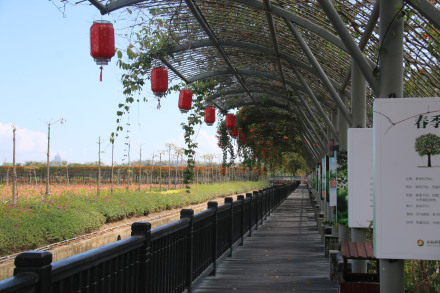 五色長(zhǎng)廊長(zhǎng)達(dá)200米,利用原生態(tài)爬藤類(lèi)植物打造而成,炮仗花、使君子、百香果長(zhǎng)年環(huán)繞于長(zhǎng)廊頂,四季花開(kāi)、碩果累累、香飄四溢,長(zhǎng)廊腳基處龍船花爭(zhēng)先斗艷,形成了一座天然文化欣賞景觀。