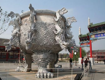 九龍鼎采用杯、羹、匙、盅、盤、碟、碗等青花玲瓏瓷具近4萬件,鼎高和直徑均為6米,最大處直徑10米,通過資深彩燈匠人利用棉線,親手捆扎手工編織而成。各類瓷器都按照設(shè)計圖紙標(biāo)準(zhǔn)施工,制作工藝精巧、制作過程嚴(yán)謹(jǐn)。主體為鋼結(jié)構(gòu),整體外光源,龍頭有LED追光變幻和噴霧效果。其創(chuàng)意深邃,規(guī);趾,構(gòu)思巧妙、制作精致、氣勢磅礴,既露王者風(fēng)范又顯民俗特色。