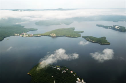 鏡泊湖水系包括大小約30多條河流,呈向心式匯入湖中。這些河流多屬山溪性質(zhì),水流湍急,徑流集散速度很大,具有含沙量小、年徑流量大、流量季節(jié)變化明顯、冰期較長等特點。鏡泊湖南北長45公里,東西最寬處6000米,最窄處300米,一般寬度在500~1000米之間,最深處70米(在鏡泊湖北部水域),水面積79.3平方公里,蓄水量約16億立方米。第二大湖泊小北湖長約6000米,水面積3.80平方公里。鏡泊湖水位年內(nèi)變化特征如下:最高水位多出現(xiàn)在八月至九月,最低水位多出現(xiàn)在三月至四月,多年平均水位為347.95米,最高水位為354.43米,最低水位為339.17米。鏡泊湖水源于牡丹江。牡丹江發(fā)源于吉林省長白山牡丹嶺,江水比降大,鏡泊湖距牡丹江源頭約300公里,落差達(dá)750米左右。
