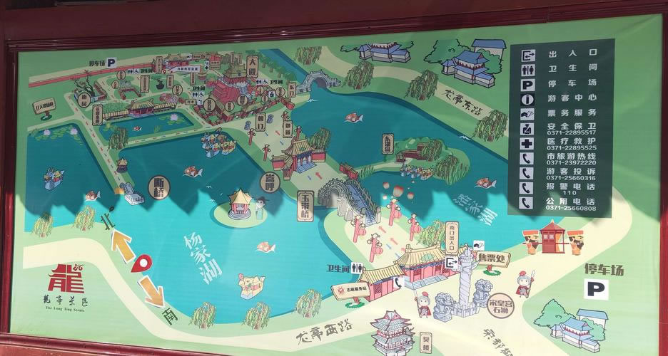 占地面積1300多畝,其中水域面積710畝。全園包括午門、玉帶橋、朝門、照壁、朝房、龍亭公園、北宋皇宮宸拱門遺址、碑亭、北門及東門等清朝萬壽宮建筑群體,還有潘楊二湖、春園、盆景園、號(hào)稱中原一絕的植物造型園及長(zhǎng)廊水榭等園林景觀。龍亭公園大殿高26.7米,基高13米,坐北朝南。東西兩側(cè)各有八間朝房,與大殿組成完整的宮殿院落,其內(nèi)建有中國(guó)首座大型宋代蠟像館,63個(gè)人物蠟像形神兼?zhèn),栩栩如生。御道兩?cè)為著名的楊湖和潘湖。雖然兩湖東西相鄰,但楊湖清澈見底,恰似北宋名臣楊繼業(yè)的光明磊落,潘湖卻渾濁不堪,正如北宋奸臣潘美的卑鄙齷齪。整個(gè)園區(qū)既有北方宮殿雄渾之氣魄,又兼南國(guó)園林秀麗之風(fēng)姿。