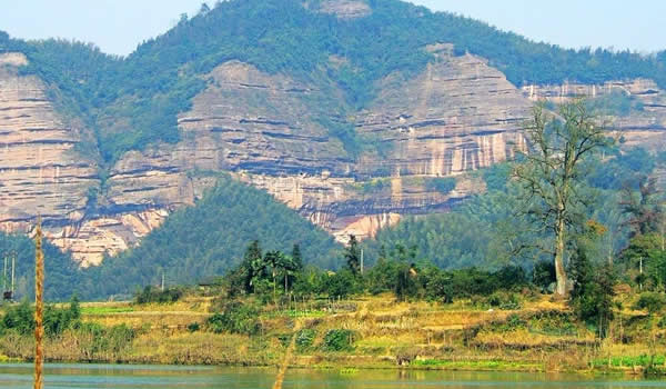 銅梁山位于湘潭縣石鼓鎮(zhèn)境內(nèi),山脈海拔700多米,地勢(shì)極為偏僻,正好處于湘潭縣與雙峰縣的交界之處。銅梁山名稱由來還有個(gè)美麗的傳說。在雙峰縣井字鎮(zhèn)與湘潭縣、湘鄉(xiāng)市交界處,有一座大山叫昌山。主峰靈應(yīng)峰海拔755.1米,是南岳72峰之一。在主峰與鷹尖石之間,橫臥著一條長(zhǎng)達(dá)2公里的一字形平脊嶺,當(dāng)?shù)厝私兴?ldquo;一字大脊”。相傳有一仙人挑著兩個(gè)大小不一的籮筐,掌燈時(shí)分就來到了大山腳下的花山村。熱情好客的花山人見了這位外來客人,格外歡喜,他們以美酒佳肴相陪,不知不覺已到雞鳴。仙人突然想起師父“雞鳴前一定要翻過大山”的教誨,趲告辭,挑起擔(dān)子飛也似的上山去?墒牵涂偷幕ㄉ饺艘粫(huì)兒便發(fā)現(xiàn),那人的擔(dān)子擱在了山頂,扁擔(dān)成了一條“一字脊”,兩個(gè)籮筐便成了一字脊兩端的“巒柱”,形似一個(gè)巨大的銅梁。因此,銅梁山這個(gè)美名便叫開了。