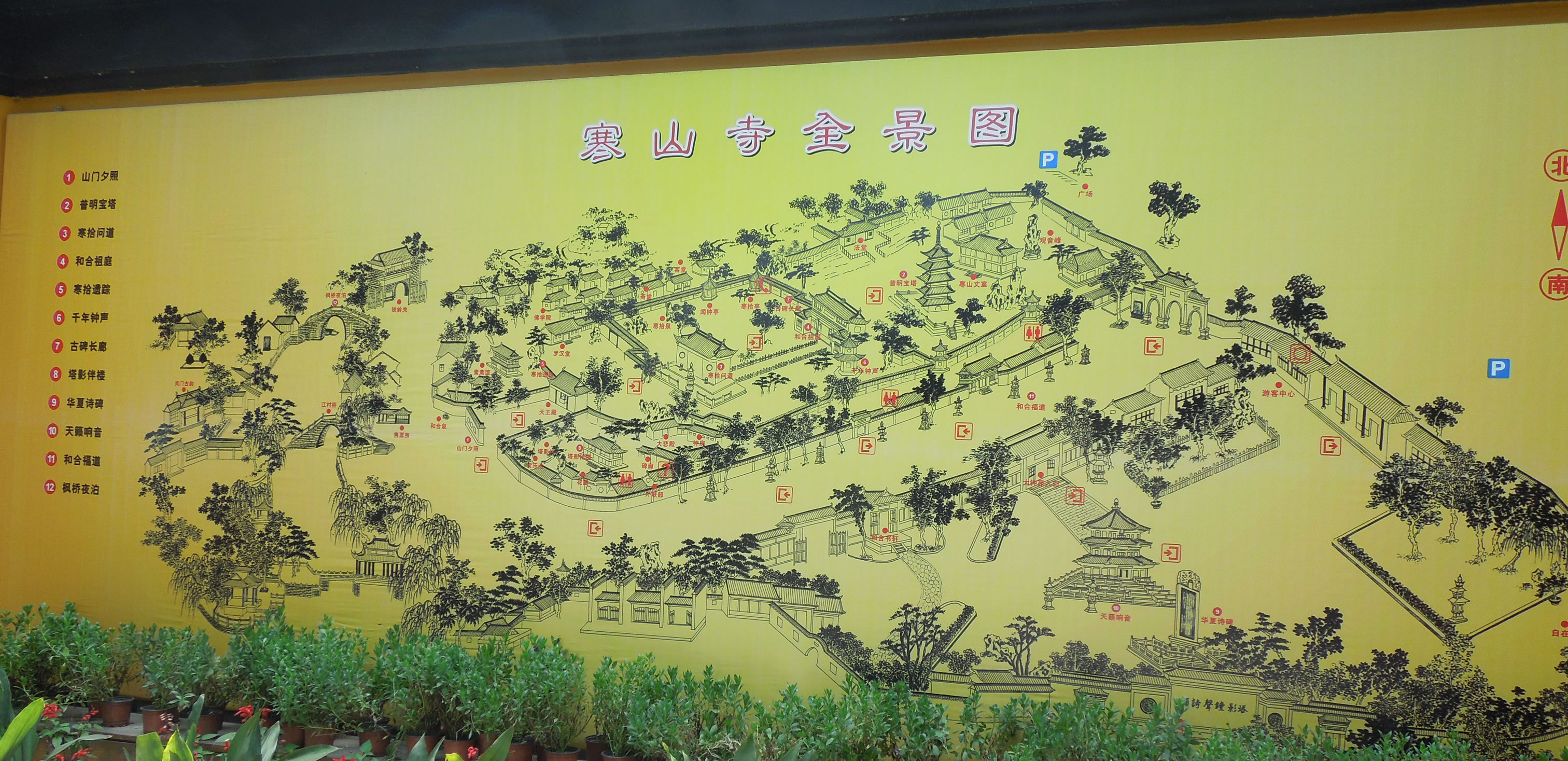 寒山寺的主庭園左側(cè)的花壇兩面嵌長條石刻兩塊,一為明代崇幀年間刻的"寒拾遺蹤";另一刻清末江蘇巡撫程德全寫的"妙利宗風(fēng)"。出大雄寶殿,左通普明寶塔和方丈室,右達(dá)名聞遐邇的聽"夜半鐘聲"的鐘樓,正前方的兩層屋宇是藏經(jīng)樓。遠(yuǎn)望屋頂,可見唐僧、孫悟空等西天取經(jīng)塑像群。藏經(jīng)樓樓上秘藏珍貴佛經(jīng),樓下叫"寒拾殿",寒拾殿后墻的背面立一巨碑,刻著千手千眼觀音、韋馱和關(guān)公等人物。鐘樓就在寒拾殿旁。