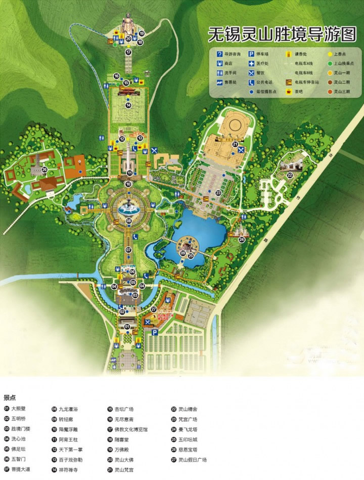 靈山大佛景區(qū)位于無錫太湖國(guó)家旅游度假區(qū),占地面積約30公頃。從靈湖大型果園停車場(chǎng)步行至照壁廣場(chǎng),可見三山環(huán)抱,靈山大佛巍然屹立,氣勢(shì)雄偉壯觀。大佛南面太湖,背倚靈山,左挽青龍(山),右牽白虎(山),地靈形勝,風(fēng)水佳絕,為難得之佛國(guó)寶地。靈山大照壁可謂