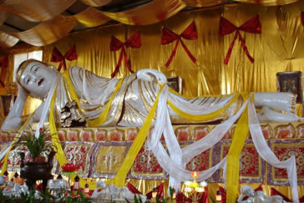 釋迦牟尼涅槃像由名貴的緬甸白玉精雕細琢而成。白玉毛料1999年在緬甸發(fā)現(xiàn),歷經(jīng)三年艱苦開采,始現(xiàn)于世。玉料為一塊完整一體的純天然玉料。據(jù)玉材的天然造型,經(jīng)過精心設計,由德純藝高的工匠歷兩年時間精工雕成。佛像長8.9米,高2.45米,總寬1.35米,體型比例均確。玉佛全身鑲嵌有1500多粒紅、藍、紫晶寶石和翡翠,衣紋和蓮花臺由24K黃金鎦金而成,彩繪部分采用天然石色彩畫而成。