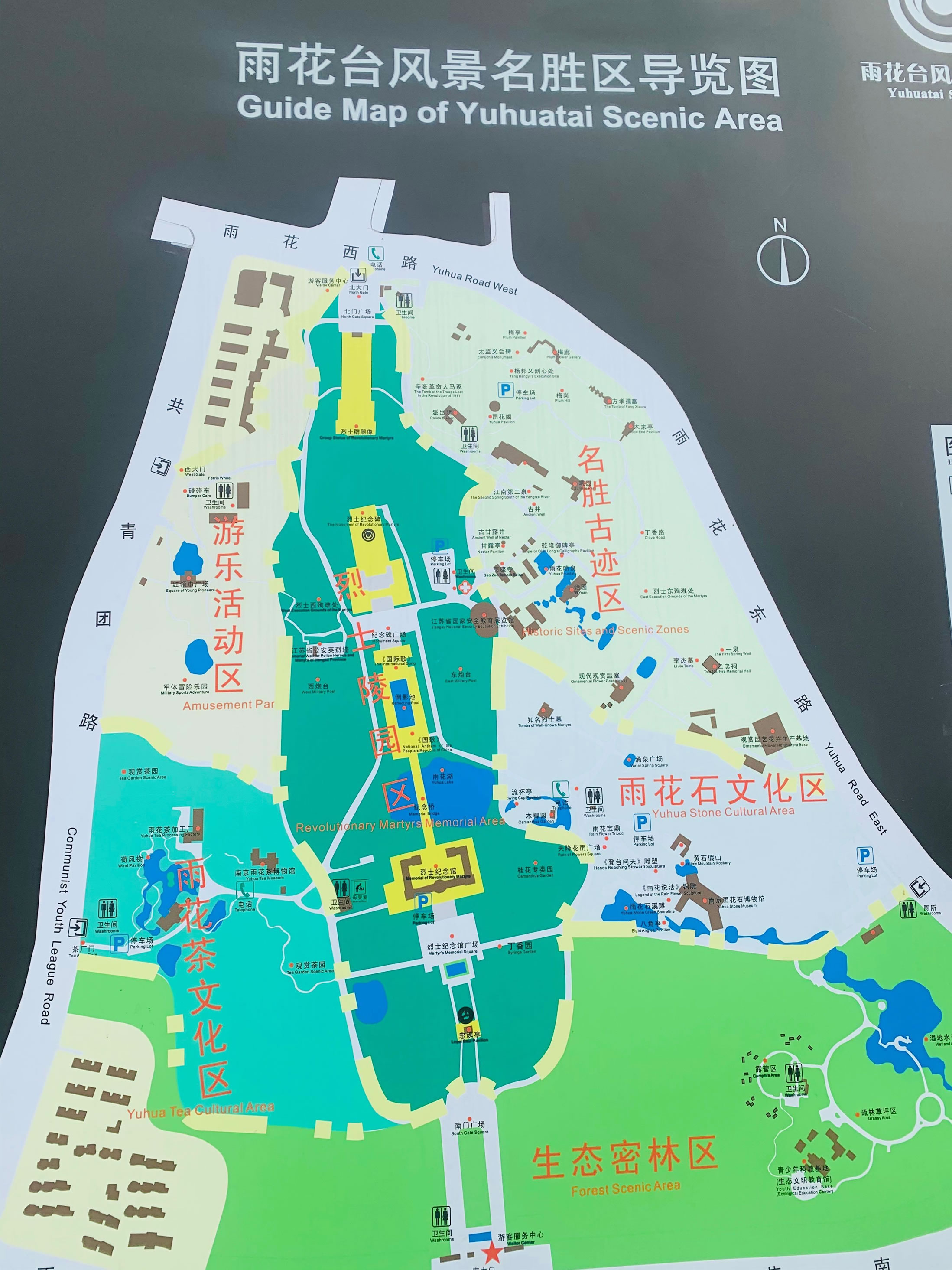 雨花臺風景名勝區(qū)由名勝古跡區(qū)、烈士陵園區(qū)、雨花石文化區(qū)、雨花茶文化區(qū)、游樂活動區(qū)和生態(tài)密林區(qū)六大功能區(qū)組成。復(fù)建了雨花閣、二忠祠、木末亭、乾隆御碑亭、方孝孺墓、辛亥革命人馬冢、甘露井、曦園、怡苑、梅崗等20余處名勝古跡和樓臺亭閣館。