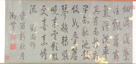 清弘歷行書對雨詩卷:此書卷作于乾隆十八年(1753)。綠色片金蠟箋紙。引首騎縫鈐篆書朱文“石渠寶笈所藏”方印,行書寫自作五言律詩一首,全詩為“細灑復(fù)絮注,飄蒲爽氣浮。洗車真有雨,壽扇果知秋。池轂紋如疊,檐琴韻轉(zhuǎn)悠。晚來云影散,更喜素蟾流。”詩后自題“對雨作”,后署款“癸酉新秋月,御筆”。