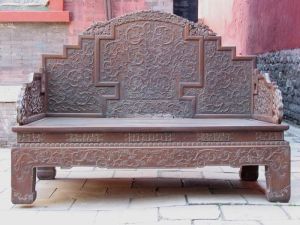 崇政殿室內(nèi)的寶座、屏風(fēng)等陳設(shè),并非清太宗時期的原貌,而是乾隆十二年(1747年)根據(jù)皇帝的旨意重新設(shè)計制做的,堂陛之內(nèi)的屏風(fēng)寶座,是乾隆特命仿北京故宮乾清宮所用加以縮小精心制作的,寶座、屏風(fēng)各以九條龍做為主要裝飾,全部罩以金漆,體現(xiàn)其唯一的使用者──皇帝的無上尊嚴。屏風(fēng)上的四言十二句銘文,與乾清宮屏風(fēng)上的完全相同 ,是康熙皇帝從古代經(jīng)書中摘出,做為自己和后世皇帝治理國家的座右銘鐫刻在御座之旁的。陳設(shè)在龍椅前后的鶴式燭臺、熏爐、塔式香亭、 端、“太平有象”等,都是乾隆年間宮中精制的琺瑯禮器,專用于皇帝御座周圍,既為熏香之用,也有驅(qū)邪諏吉的寓意,使得“真龍?zhí)熳印迸R朝理政之處更具有莊嚴神圣的氣氛。乾隆、嘉慶、道光幾位皇帝東巡盛京期間,都曾坐在這里接受群臣的朝賀叩拜,慶祝自己祭陵大典的成功。