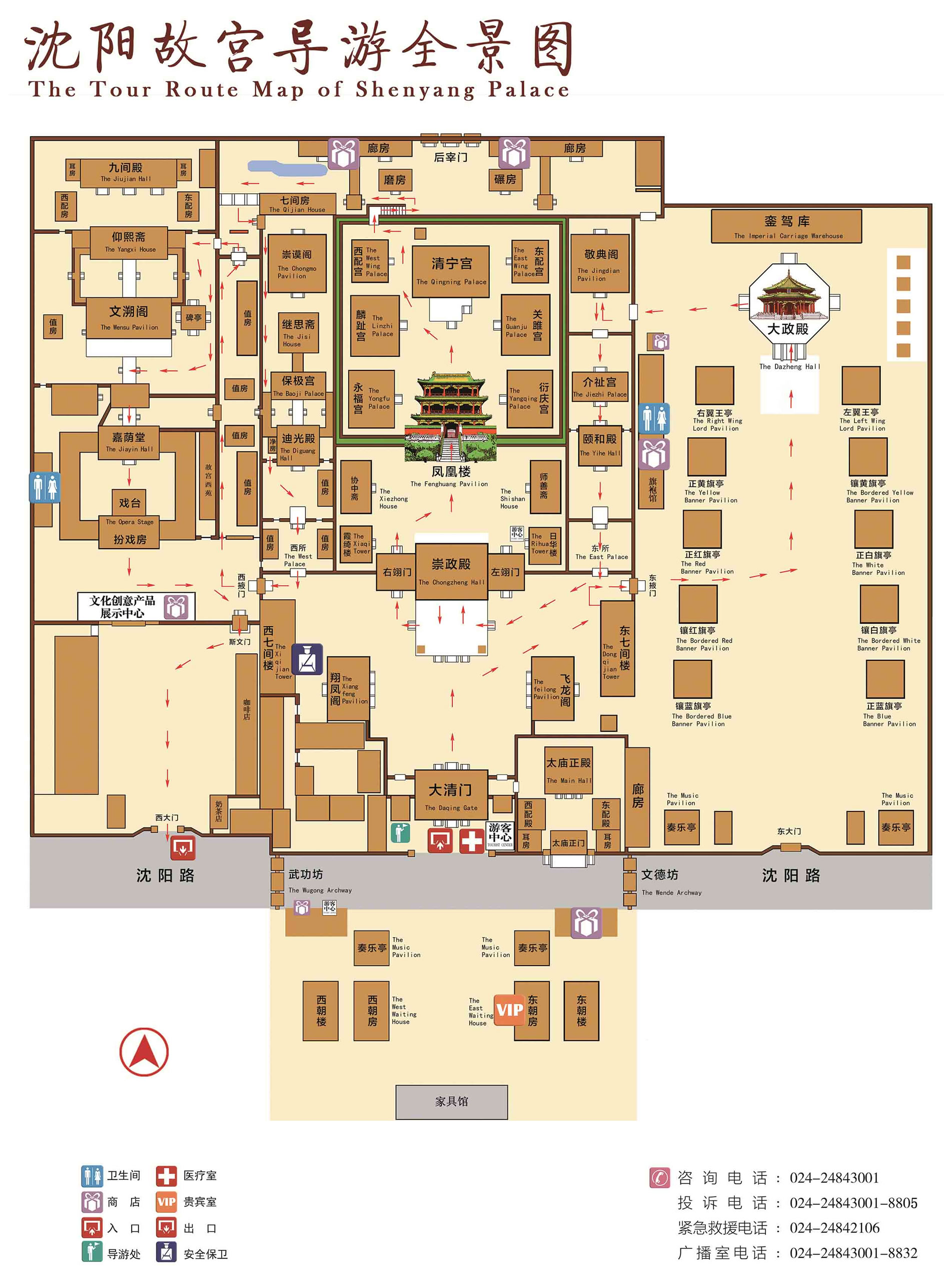 中路為整個建筑群的中心,分前后3個院落。南端為照壁、東西朝房、奏樂亭;前院有大清門、崇政殿、飛龍閣、翔鳳閣;中院有師善齋、協(xié)中齋、鳳凰樓;后院是以清寧宮為主的五宮建筑。中院和后院兩側(cè)各有一跨院,稱東宮、西宮。東宮有頤和殿、介祉宮、敬典閣;西宮有迪光殿、保極宮、繼思齋、崇謨閣。大清門是沈陽故宮的正門,是文武群臣候朝之處,為五間硬山式建筑,正脊、垂脊及兩山的“墀頭”均以五彩琉璃鑲造。崇政殿是故宮的正殿,建于后金天聰時,是清初朝會之所,為五間九檁硬山式,俱辟隔扇門,前后有出廊,圍以石雕欄桿。頂蓋黃琉璃瓦鑲綠剪邊,殿內(nèi)徹上明造,梁架全部為和璽彩繪。殿前東置日晷,西設(shè)嘉量。殿后是鳳凰樓,同清寧宮、關(guān)睢宮、衍慶宮、永福宮、麟趾宮五宮建在近4米的高臺之上,四周繞以高墻,獨成一座宮院。