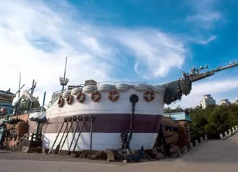 海盜村以海盜和海盜景物的卡通造型,對所有建筑,游樂設(shè)施、休閑場所,景觀進行包裝。一期工程中的海盜船,是國內(nèi)僅有的架設(shè)在海灣海平面上的海盜船。它的支點高13.5米,最大擺角120度,每船可以乘游客40人。