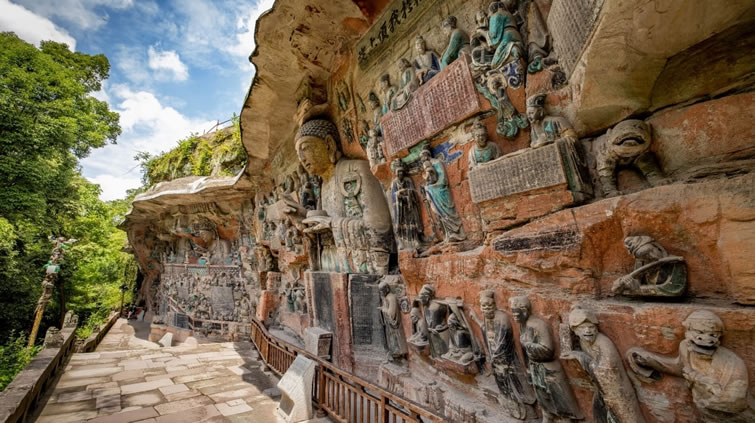 大足石刻景區(qū)位于重慶市大足區(qū),是世界文化遺產(chǎn)、國(guó)家5A級(jí)旅游景區(qū),也是世界八大石窟之一。景區(qū)始建于初唐,鼎盛于兩宋,代表了公元9至13世紀(jì)世界石窟藝術(shù)的最高水平,以寶頂山、北山、南山、石門(mén)山、石篆山“五山”為代表,共有造像5萬(wàn)余尊,銘文10萬(wàn)余字。大足石刻是石窟藝術(shù)史上的晚期杰作,將佛教、道教、儒家思想融合,展現(xiàn)了宋代以來(lái)的社會(huì)生活、信仰與藝術(shù)成就,被譽(yù)為“東方藝術(shù)明珠”。
