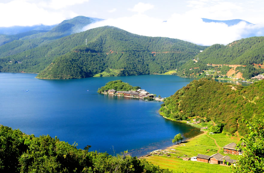 麗江瀘沽湖摩梭文化旅游區(qū),地處麗江市寧蒗縣永寧鄉(xiāng)與四川省鹽源縣左所鄉(xiāng)交界處,是摩梭族人的主要聚居地,素有“高原明珠”之稱,是云南省九大高原湖泊之一。行政區(qū)劃上,瀘沽湖隸屬四川省鹽源縣和云南省寧蒗縣共同管轄,其中四川省鹽源縣管轄東部的29.6平方千米(含沼澤濕地5.8平方千米),云南省寧蒗縣管轄西部的27.0平方千米。瀘沽湖,在地貌區(qū)劃上屬橫斷山系切割山地峽谷區(qū),橫斷山北段高山峽谷亞區(qū)和滇東盆地山原區(qū),滇西北中山山源亞區(qū)交界地帶。瀘沽湖湖岸多彎曲,形成深淵的小港灣,湖中有大小島嶼七個(gè),都是石灰?guī)r殘丘。沿湖東部湖底有長形深槽,北部和長島兩側(cè)的湖坡陡峻。湖北面有獅子山,東北面有肖家火山,西南為狗鉆洞山地。