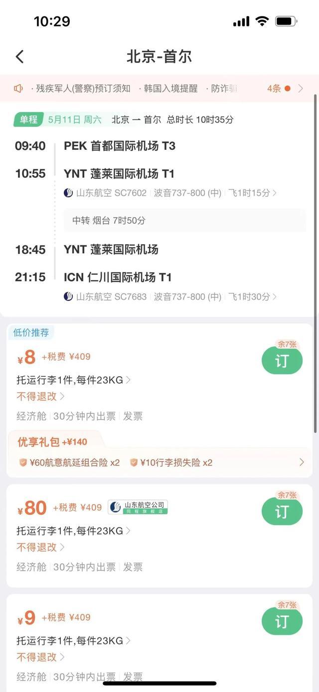 國際機票方面,中新經(jīng)緯查詢發(fā)現(xiàn),5月11日北京飛往首爾的機票(不含稅)價格低至8元,但另需409元稅費。具體來看,該航班5月11日早9點40分從北京首都機場起飛,經(jīng)煙臺蓬萊國際機場轉(zhuǎn)機,于當(dāng)天晚上9點15分落地仁川國際機場。