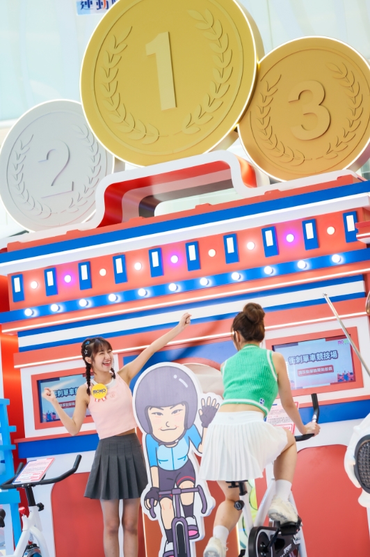 寓意慶祝勝利的凱旋門上方豎立著所有運(yùn)動(dòng)員都渴望于這國際體壇舞臺(tái)贏取的金銀銅牌,寄托了對(duì)我國運(yùn)動(dòng)員的美好祝福,游客更可參與單車互動(dòng)競技游戲,踏上單車裝置與現(xiàn)場“小女車神”齊齊破風(fēng),以最快速度完成200米計(jì)時(shí)賽競逐“車神”寶座。