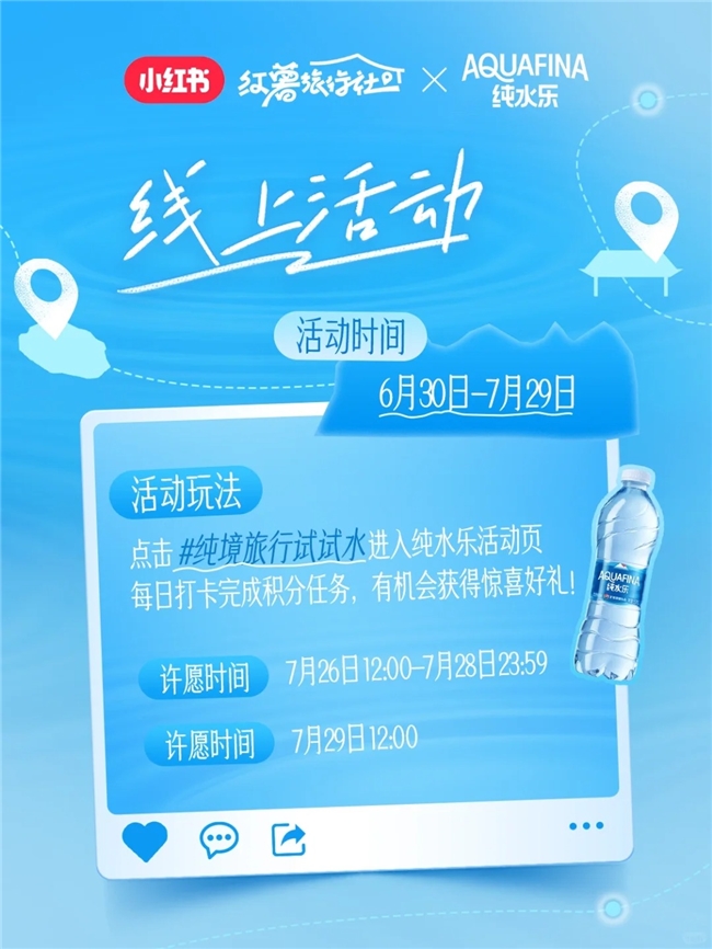 貼合旅行魅力,一場線上線下聯(lián)動的全新旅行玩法就此展開。@AQUAFINA純水樂 官方賬號在小紅書發(fā)布游玩號召視頻官宣活動,分享這場“水是純凈的,心是自由的”旅行概念。小紅書@好好玩情報局 承接活動外放,介紹線上線下活動玩法,正式開啟為期一個月的攢積分任務限時許愿贏好禮活動,以趣味性互動玩法、豐厚的獎勵機制吸引用戶主動關鍵詞搜索、品牌筆記瀏覽、品牌主頁關注、分享品牌信息,助力純水樂品牌成功將流量變?yōu)榱?ldquo;留量”。