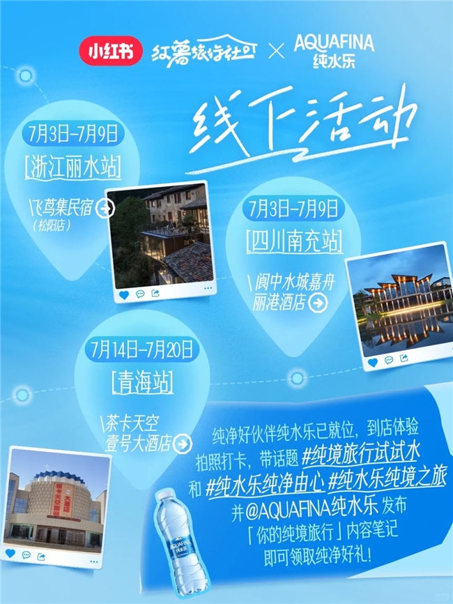 在三位“先鋒試水官”的帶動下,四川南充、浙江麗水、青海三大純境路線被更多用戶關注。純水樂也協(xié)同小紅書在三大純境路線合作的民宿酒店設置線上線下聯(lián)動新玩法。7月3日-7月9日,浙江麗水站飛蔦集民宿(松陽店)、四川南充站閬中水城嘉舟麗港酒店線下互動贏好禮活動率先啟動,位于青海的茶卡天空壹號大酒店7月14日-7月20日也很快解鎖加入該活動。