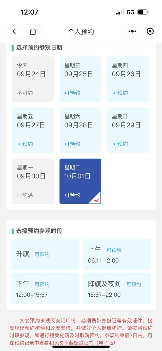 9月24日中午12時,10月1日“升旗”時段的預約對外開放。不到半小時,國慶節(jié)當天“升旗”已經(jīng)全部約滿。