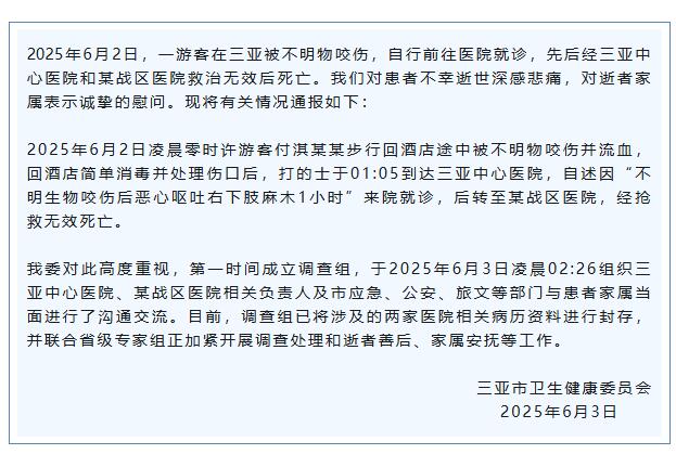 據(jù)“三亞市衛(wèi)生健康委”微信公眾號消息,6月2日,一游客在三亞被不明物咬傷,自行前往醫(yī)院就診,先后經(jīng)三亞中心醫(yī)院和某戰(zhàn)區(qū)醫(yī)院救治無效后死亡。三亞市衛(wèi)生健康委將有關情況通報如下: