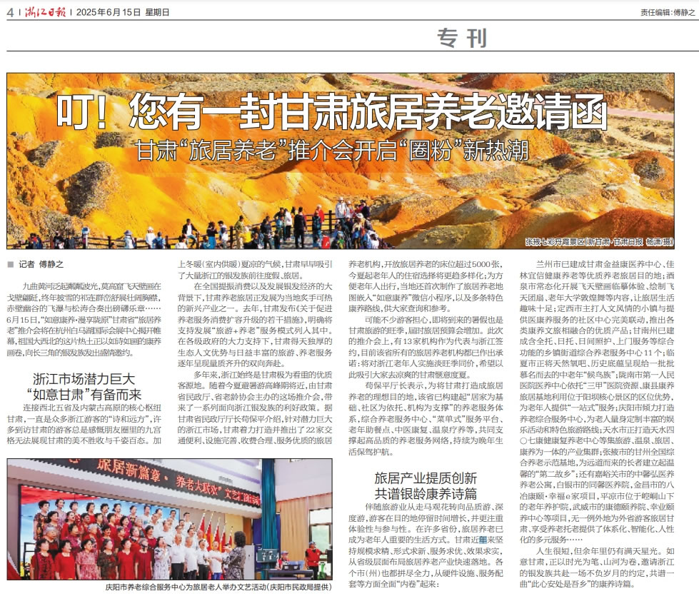 作為中國最大的游客輸出省之一,浙江始終是甘肅極為看重的優(yōu)質(zhì)客源地。隨著2025年度的夏季避暑游高峰期將近,6月15日,“如意康養(yǎng)·漫享隴原”甘肅省“旅居養(yǎng)老”推介會正式走進(jìn)杭州,本次大會由甘肅省民政廳、甘肅省老齡協(xié)會主辦,甘肅省福利彩票發(fā)行管理中心協(xié)辦,來自浙隴兩地民政部門、養(yǎng)老機(jī)構(gòu)、旅行社、新聞媒體圈的數(shù)百位嘉賓與市民游客參加了本次推介活動。
