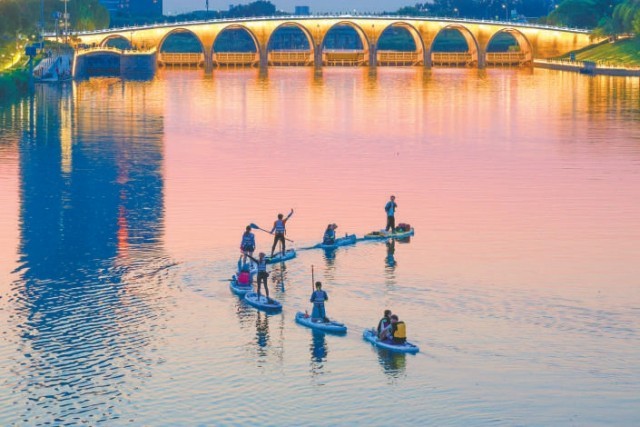 水聲、指導(dǎo)聲,夾雜著成功駕馭后的歡呼聲,交織成大運河上獨特的活力樂章。微風(fēng)拂過,帶來水汽的清涼,也吹散了一些夏日燥熱。阿珂說,俱樂部正在推廣“城市微度假、微旅行”的理念,給年輕人打造一個不用出遠門就有休閑度假感的娛樂解壓場景。“大運河比城里的護城河、亮馬河寬闊得多,傍晚時分波光粼粼的感覺棒極了!濱水休閑步道以及各類配套服務(wù)設(shè)施也挺完善,真的很適合微度假。”他說,接下來希望能帶更多人在大運河上體驗槳板運動的快樂。