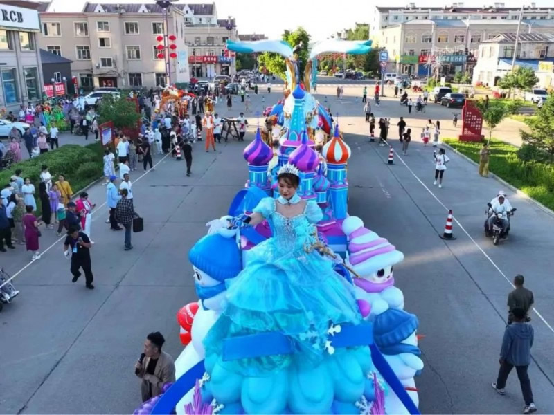 “冰雪綺夢(mèng)花車”,巧妙融合了伊春作為“紅松故鄉(xiāng)”的生態(tài)特色與對(duì)俄開放的地緣優(yōu)勢(shì)。銀裝素裹的紅松林展現(xiàn)北國(guó)冰雪魅力,俄羅斯城堡造型呼應(yīng)伊春作為中俄邊境城市的開放姿態(tài)。雪人點(diǎn)綴其間營(yíng)造歡樂氛圍,底部藍(lán)色水系裝飾象征黑龍江流域的聯(lián)通作用;ㄜ囃ㄟ^冰雪童話場(chǎng)景,既展示了伊春冬季旅游的獨(dú)特吸引力,更傳遞出“以冰雪為媒,促開放合作”的發(fā)展理念,生動(dòng)詮釋了伊春立足生態(tài)優(yōu)勢(shì)、深化對(duì)外合作、推動(dòng)高質(zhì)量發(fā)展的戰(zhàn)略方向,誠(chéng)邀八方賓客共赴冰雪之約、共享開放機(jī)遇。