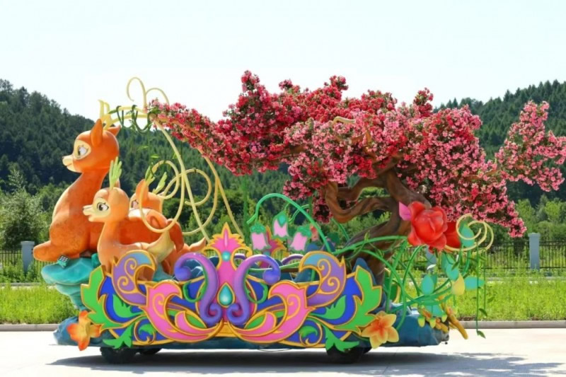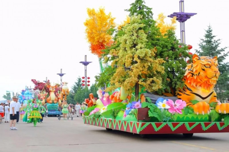 花車設(shè)計(jì)不僅注重視覺沖擊力,更融入動(dòng)態(tài)特效:虎頭擺動(dòng)、翅膀扇動(dòng)、雪花機(jī)噴灑等細(xì)節(jié),讓靜態(tài)的造型煥發(fā)生命力。夜幕降臨時(shí),花車更以夜光效果點(diǎn)亮林海,為觀眾呈現(xiàn)一場(chǎng)光影交織的奇幻盛宴。