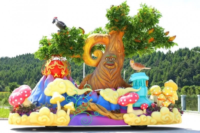 “鐘林毓秀花車”,生動(dòng)展現(xiàn)了伊春“中國(guó)林都”的綠色魅力。中央挺拔的紅松仙樹象征著伊春持續(xù)開展的植樹造林工程,樹上棲息的啄木鳥、紅隼與樹下生長(zhǎng)的藍(lán)莓、五味子,共同勾勒出生物多樣性的和諧畫卷。金祖峰日出云海的壯美景觀與八面樂舞石幢的神秘韻味,訴說(shuō)著伊春生態(tài)保護(hù)的豐碩成果;ㄜ囃ㄟ^森林生態(tài)系統(tǒng)的完整呈現(xiàn),既彰顯了伊春的生態(tài)發(fā)展理念,又傳遞出植樹造林、守護(hù)生態(tài)的永恒主題,展現(xiàn)了一座城市與自然共生共榮的生態(tài)文明實(shí)踐。