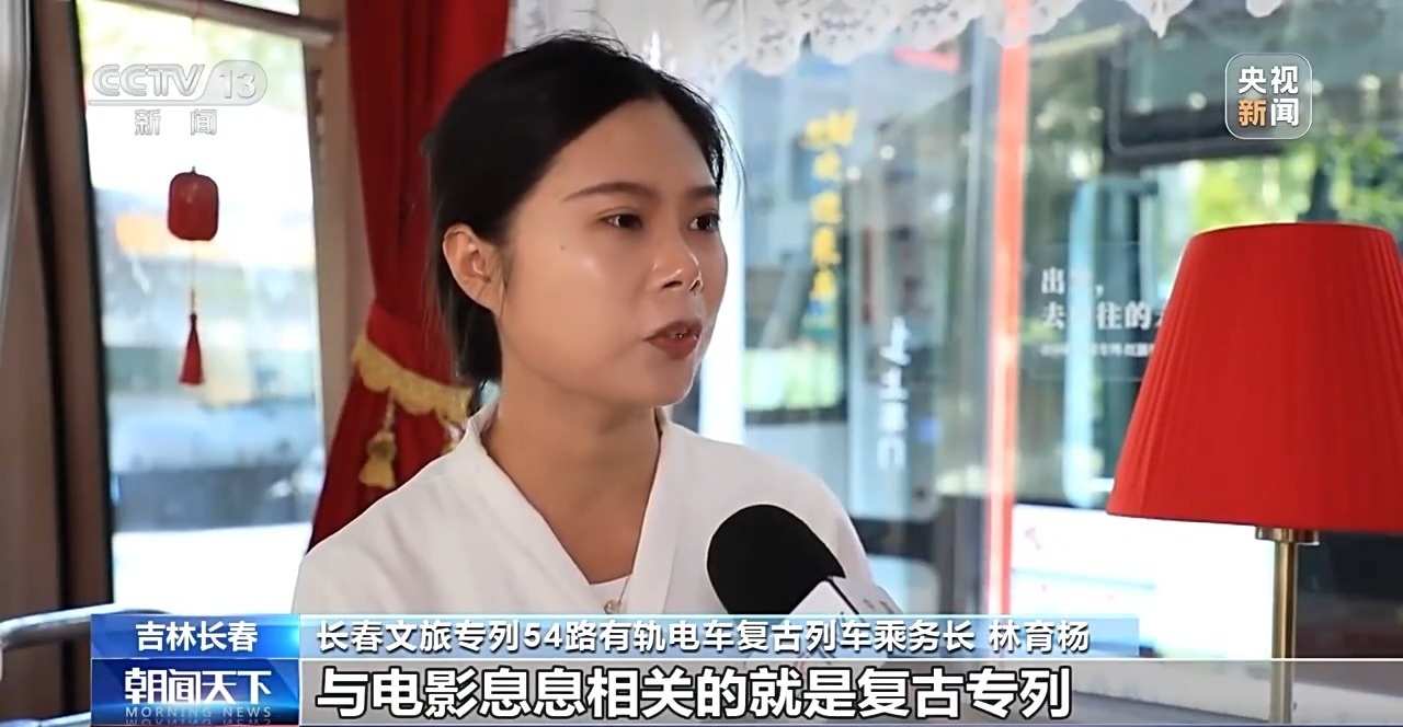 長春文旅專列54路有軌電車復(fù)古列車乘務(wù)長 林育楊:與電影息息相關(guān)的就是復(fù)古專列。它的起始站就是長影舊址博物館,途經(jīng)東風(fēng)大街、創(chuàng)業(yè)大街、南陽路,都是熱播劇的取景地。