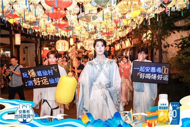 與景區(qū)千燈會深度合作,定制安慕希主題花燈共同組成巡游方陣。由好運仙官們手持花燈引領(lǐng)巡游,形成"品牌-文化-游客"三方共創(chuàng)的流動盛景。