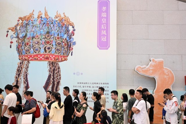 7月19日,觀眾在北京中國國家博物館排隊(duì)購買鳳冠冰箱貼。新華社記者 金良快 攝