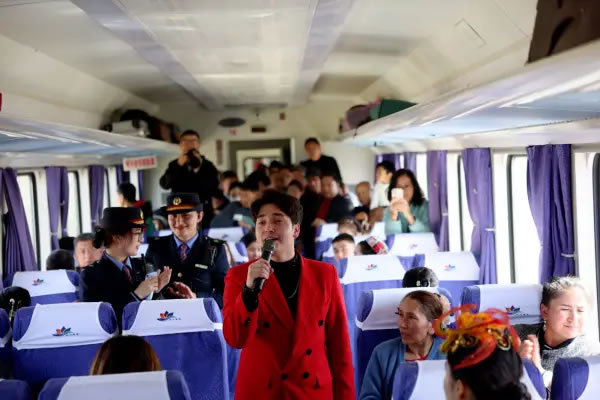 火車上,《和田是個好地方》《新疆姑娘》《祝福祖國亞克西》等經(jīng)典文藝節(jié)目輪番上演,悠揚的旋律和深情的演唱打動著在場的每一位旅客,讓車廂成為流動的舞臺。文藝表演結(jié)束后,文旅資源宣傳推介環(huán)節(jié)緊隨其后,工作人員通過生動講解與展示,帶領(lǐng)旅客提前領(lǐng)略和田的獨特風(fēng)光與人文魅力。此外,宣講人員還用接地氣的家常話、互動感十足的小問答,把理論知識講得鮮活有趣,讓旅客們在旅途的碎片時光里,既能放松休憩,又能輕松收獲思想啟迪,讓出行多了一份別樣的“精神補給”。