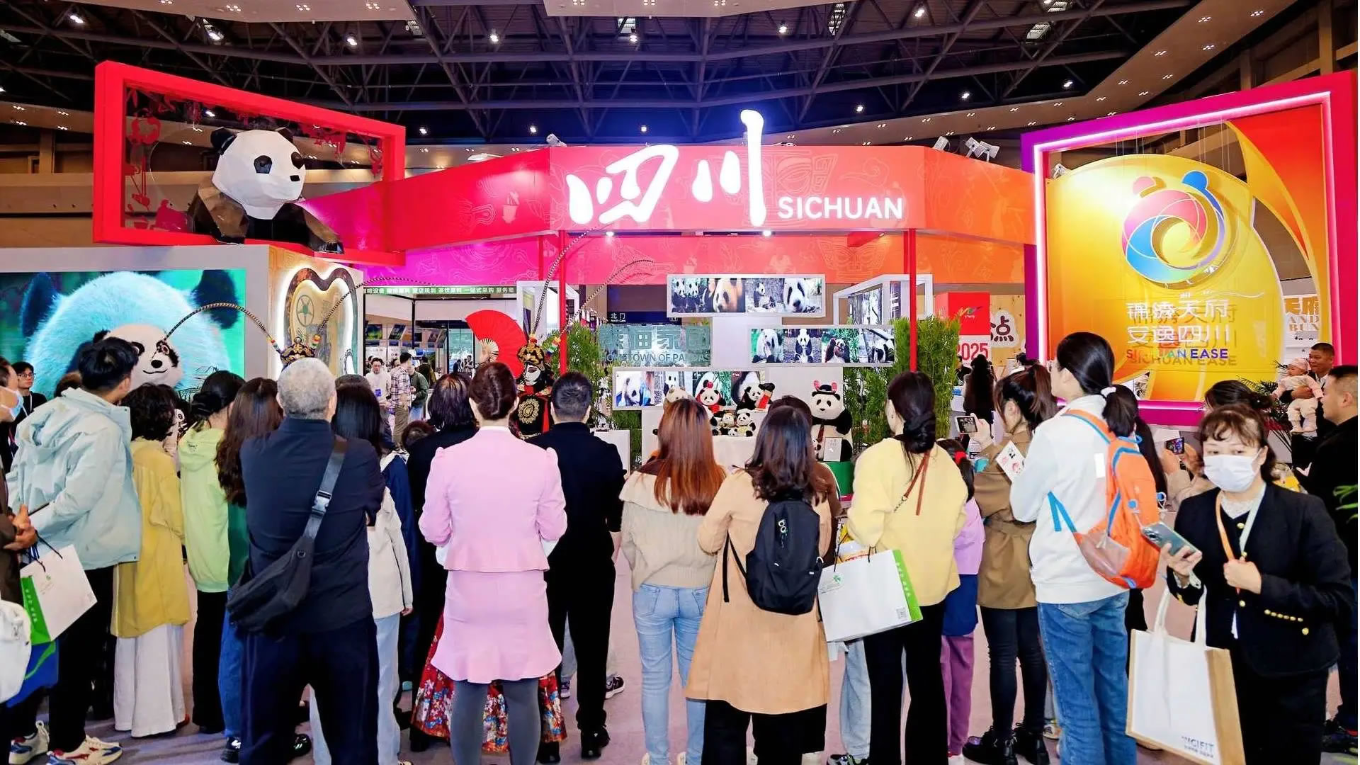 本次四川展臺位于展會核心區(qū)域,圍繞熊貓家園、古蜀文明、世界級旅游風(fēng)景道等主題打造展區(qū),F(xiàn)場不僅有諸葛羽扇綸巾杯套組等文創(chuàng)產(chǎn)品、缽缽雞等天府美食展示,宜賓面塑、長寧竹編等非遺活態(tài)體驗,還通過川劇變臉表演、“安逸熊貓”人偶巡游營造沉浸式氛圍。同時,線下文旅咨詢區(qū)提供線路與政策解讀,百萬粉絲達(dá)人巡館直播、“安逸直播間”系列活動同步開展,實現(xiàn)“線下體驗+線上云看展”雙向聯(lián)動。